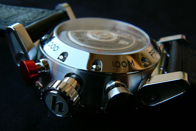 earlier). The chunky crown is decorated with the Hanhart logo and screws down